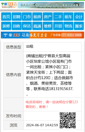{商铺出租}宁晋县大型高端小区怡家公馆小区现有门市一间出租;紧挨小区门口;紧挨天宝街;上下两层;面积合计约120㎡;适合做超市、烟酒、美容美发、茶楼等等,联系电话18131915637 【电话咨询时,请一定说明在宁晋123看到的,谢谢!】 |