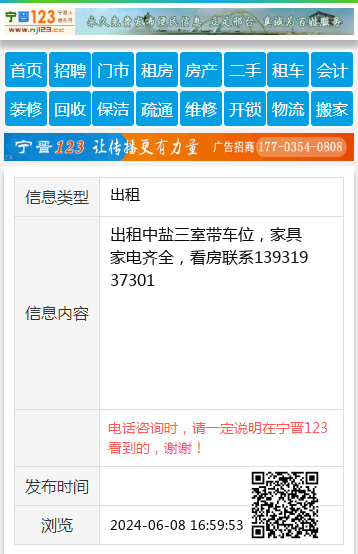 出租中盐三室带车位,家具家电齐全,看房联系13931937301