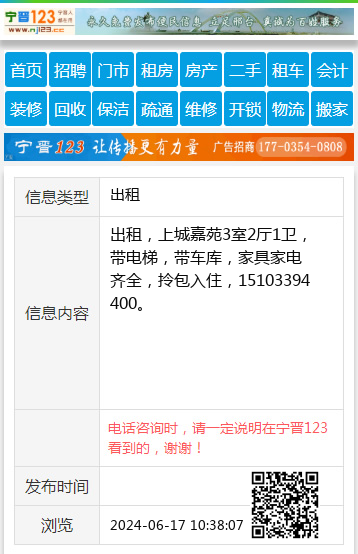 出租,上城嘉苑3室2厅1卫,带电梯,带车库,家具家电齐全,拎包入住,15103394400。
