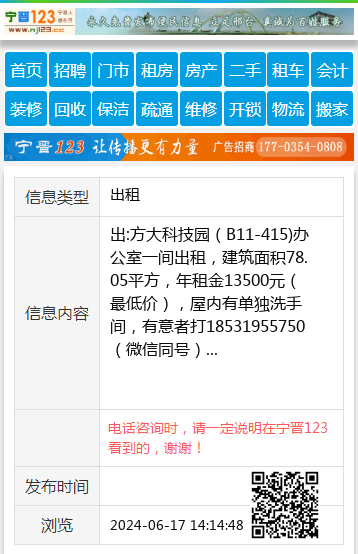出:方大科技园(B11-415)办公室一间出租,建筑面积78.05平方,年租金13500元(最低价),屋内有单独洗手间,有意者打18531955750(微信同号) 【电话咨询时,请一定说明在宁晋123看到的,谢谢!】 |