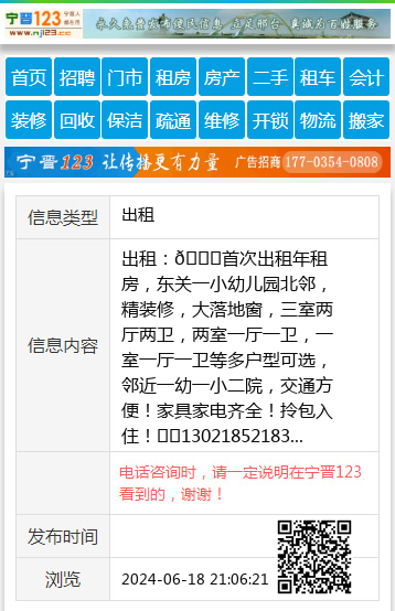 出租:👉首次出租年租房,东关一小幼儿园北邻,精装修,大落地窗,三室两厅两卫,两室一厅一卫,一室一厅一卫等多户型可选,邻近一幼一小二院,交通方便!家具家电齐全!拎包入住!☎️13021852183 【电话咨询时,请一定说明在宁晋123看到的,谢谢!】 |