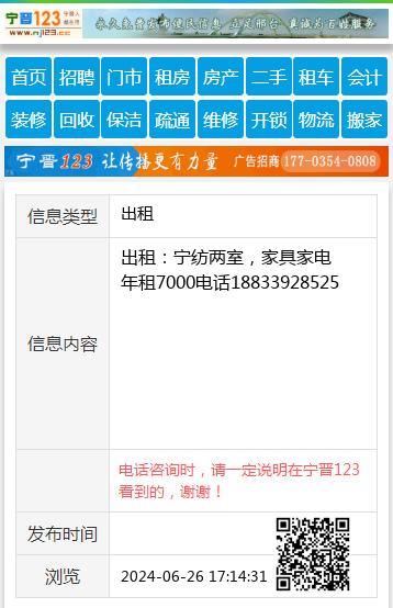 出租:宁纺两室,家具家电年租7000电话18833928525