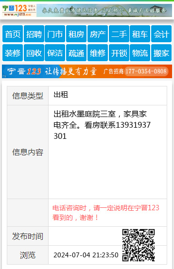 出租水墨庭院三室,家具家电齐全。看房联系13931937301