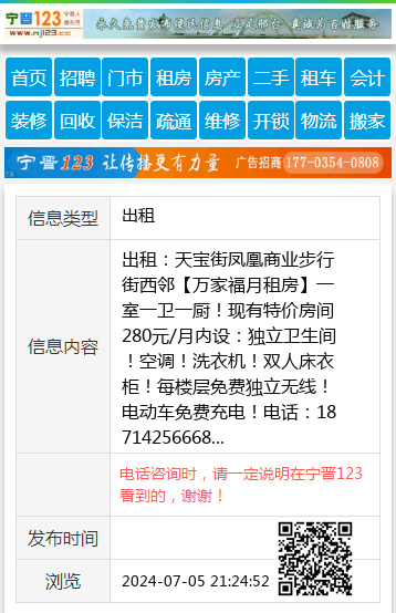 出租:天宝街凤凰商业步行街西邻【万家福月租房】一室一卫一厨!现有特价房间280元/月内设:独立卫生间!空调!洗衣机!双人床衣柜!每楼层免费独立无线!电动车免费充电!电话:18714256668 【电话咨询时,请一定说明在宁晋123看到的,谢谢!】 |
