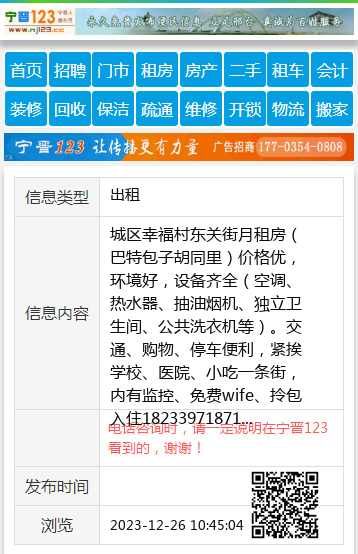 城区幸福村东关街月租房(巴特包子胡同里)价格优,环境好,设备齐全(空调、热水器、抽油烟机、独立卫生间、公共洗衣机等)。交通、购物、停车便利,紧挨学校、医院、小吃一条街,内有监控、免费wife、拎包入住18233971871 【电话咨询时,请一定说明在宁晋123看到的,谢谢!】 |