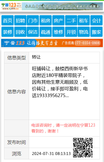 旺铺转让,鼓楼西街新华书店附近180平精装带院子,因有其他生意无暇顾及,低价转让,接手即可盈利,电话19333956275 【电话咨询时,请一定说明在宁晋123看到的,谢谢!】 |
