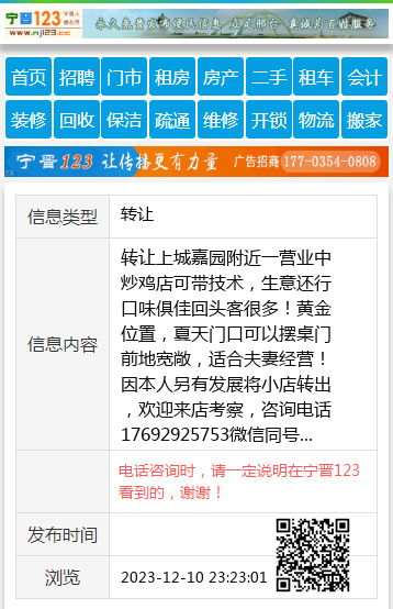 转让上城嘉园附近一营业中炒鸡店可带技术,生意还行口味俱佳回头客很多!黄金位置,夏天门口可以摆桌门前地宽敞,适合夫妻经营!因本人另有发展将小店转出,欢迎来店考察,咨询电话17692925753微信同号 【电话咨询时,请一定说明在宁晋123看到的,谢谢!】 |