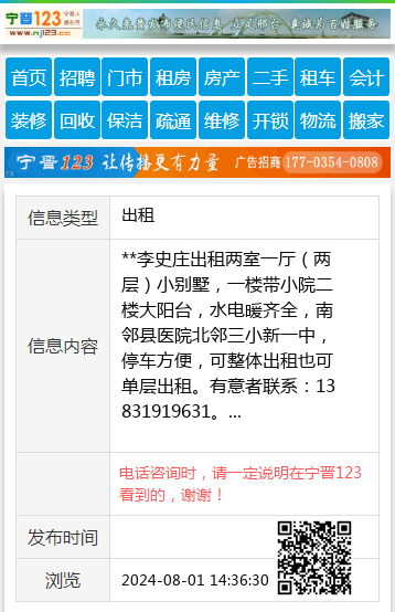**李史庄出租两室一厅(两层)小别墅,一楼带小院二楼大阳台,水电暖齐全,南邻县医院北邻三小新一中,停车方便,可整体出租也可单层出租。有意者联系:13831919631。 【电话咨询时,请一定说明在宁晋123看到的,谢谢!】 |