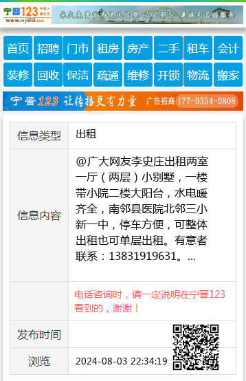 @广大网友李史庄出租两室一厅(两层)小别墅,一楼带小院二楼大阳台,水电暖齐全,南邻县医院北邻三小新一中,停车方便,可整体出租也可单层出租。有意者联系:13831919631。 【电话咨询时,请一定说明在宁晋123看到的,谢谢!】 |
