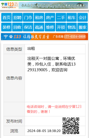 出租天一对面公寓,环境优美,拎包入住,联系电话13293139005,欢迎咨询