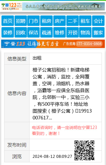橙子公寓招租啦!新建电梯公寓,消防,监控,全网覆盖,空调,油烟机,热水器,浴霸等一应俱全东临县医院,北邻新一中,实验三小,有500平停车场!地址地图搜索(橙子公寓)19913007617 【电话咨询时,请一定说明在宁晋123看到的,谢谢!】 |