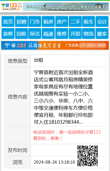 宁晋县附近首次出租全新酒店式公寓民宿月租房精装修家电家具应有尽有地理位置优越周围有实验一小二小、三小六小、华英、八中、六中等交通便利停车方便价格便宜月租、年租都行拎包即可入住18103298344 【电话咨询时,请一定说明在宁晋123看到的,谢谢!】 |