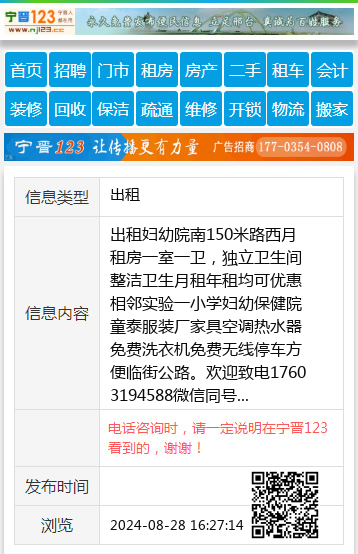 出租妇幼院南150米路西月租房一室一卫,独立卫生间整洁卫生月租年租均可优惠相邻实验一小学妇幼保健院童泰服装厂家具空调热水器免费洗衣机免费无线停车方便临街公路。欢迎致电17603194588微信同号 【电话咨询时,请一定说明在宁晋123看到的,谢谢!】 |