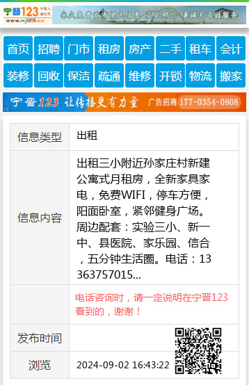 出租三小附近孙家庄村新建公寓式月租房,全新家具家电,免费WIFI,停车方便,阳面卧室,紧邻健身广场。周边配套:实验三小、新一中、县医院、家乐园、信合,五分钟生活圈。电话:13363757015 【电话咨询时,请一定说明在宁晋123看到的,谢谢!】 |