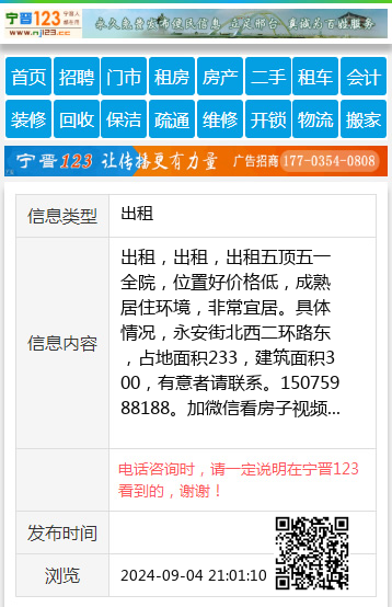 出租,出租,出租五顶五一全院,位置好价格低,成熟居住环境,非常宜居。具体情况,永安街北西二环路东,占地面积233,建筑面积300,有意者请联系。15075988188。加微信看房子视频 【电话咨询时,请一定说明在宁晋123看到的,谢谢!】 |