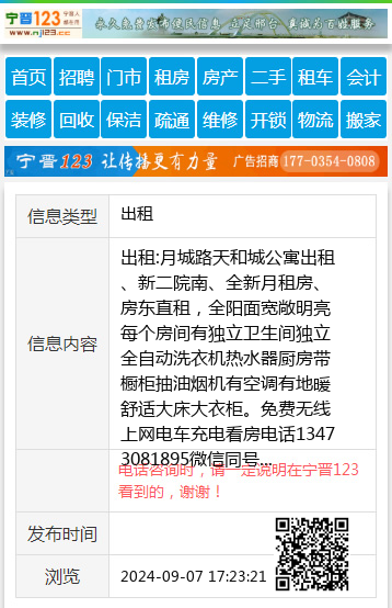 出租:月城路天和城公寓出租、新二院南、全新月租房、房东直租,全阳面宽敞明亮每个房间有独立卫生间独立全自动洗衣机热水器厨房带橱柜抽油烟机有空调有地暖舒适大床大衣柜。免费无线上网电车充电看房电话13473081895微信同号 【电话咨询时,请一定说明在宁晋123看到的,谢谢!】 |