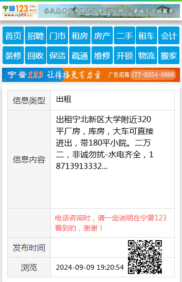 出租宁北新区大学附近320平厂房,库房,大车可直接进出,带180平小院。二万二,非诚勿扰-水电齐全,18713913332 【电话咨询时,请一定说明在宁晋123看到的,谢谢!】 |