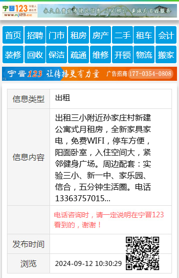 出租三小附近孙家庄村新建公寓式月租房,全新家具家电,免费WIFI,停车方便,阳面卧室,入住空间大,紧邻健身广场。周边配套:实验三小、新一中、家乐园、信合,五分钟生活圈。电话13363757015 【电话咨询时,请一定说明在宁晋123看到的,谢谢!】 |