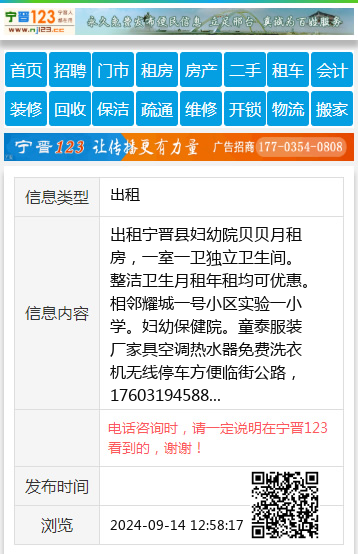 出租宁晋县妇幼院贝贝月租房,一室一卫独立卫生间。整洁卫生月租年租均可优惠。相邻耀城一号小区实验一小学。妇幼保健院。童泰服装厂家具空调热水器免费洗衣机无线停车方便临街公路,17603194588 【电话咨询时,请一定说明在宁晋123看到的,谢谢!】 |