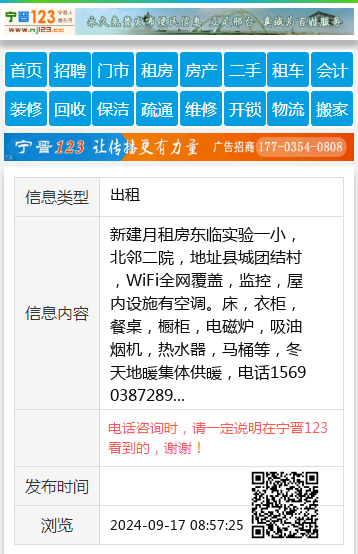 新建月租房东临实验一小,北邻二院,地址县城团结村,WiFi全网覆盖,监控,屋内设施有空调。床,衣柜,餐桌,橱柜,电磁炉,吸油烟机,热水器,马桶等,冬天地暖集体供暖,电话15690387289 【电话咨询时,请一定说明在宁晋123看到的,谢谢!】 |