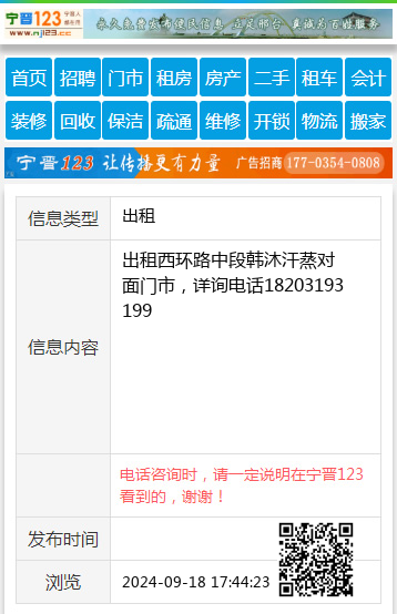 出租西环路中段韩沐汗蒸对面门市,详询电话18203193199