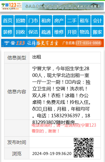 宁晋大学,今年招生学生2800人,现大学北边出租一室一厅一卫一厨!❤️内设:独立卫生间!空调!洗衣机!双人床!衣柜!冰箱!办公桌椅!免费无线!拎包入住。🌸日租,月租,年租均可。电话:15832936397,18832993802随时看房 【电话咨询时,请一定说明在宁晋123看到的,谢谢!】 |