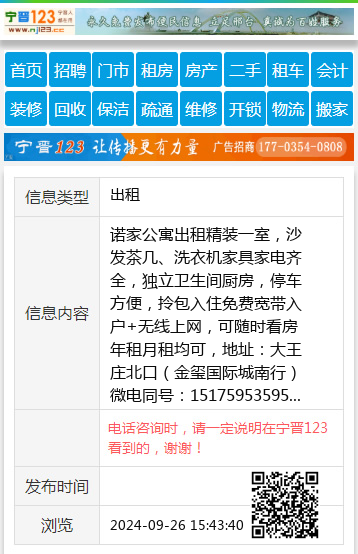 诺家公寓出租精装一室,沙发茶几、洗衣机家具家电齐全,独立卫生间厨房,停车方便,拎包入住免费宽带入户+无线上网,可随时看房年租月租均可,地址:大王庄北口(金玺国际城南行)微电同号:15175953595 【电话咨询时,请一定说明在宁晋123看到的,谢谢!】 |