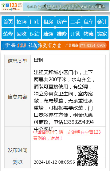 出租天和城小区门市,上下两层共200平米,水电齐全,简装可直接使用,有空调,独立分男女卫生间,室内宽敞,布局规整,无承重柱承重墙,可根据需要改装,门口宽敞停车方便,租金优惠可商议。电话13393294394中介勿扰 【电话咨询时,请一定说明在宁晋123看到的,谢谢!】 |