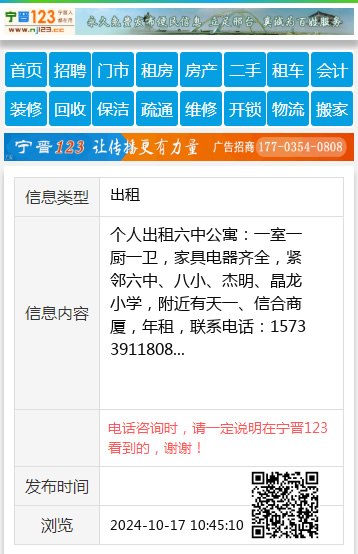 个人出租六中公寓:一室一厨一卫,家具电器齐全,紧邻六中、八小、杰明、晶龙小学,附近有天一、信合商厦,年租,联系电话:15733911808 【电话咨询时,请一定说明在宁晋123看到的,谢谢!】 |