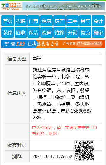 新建月租房月城路团结村东临实验一小,北邻二院,WiFi全网覆盖,监控,屋内设施有空调。床,衣柜,餐桌,橱柜,电磁炉,吸油烟机,热水器,马桶等,冬天地暖集体供暖,电话15690387289 【电话咨询时,请一定说明在宁晋123看到的,谢谢!】 |