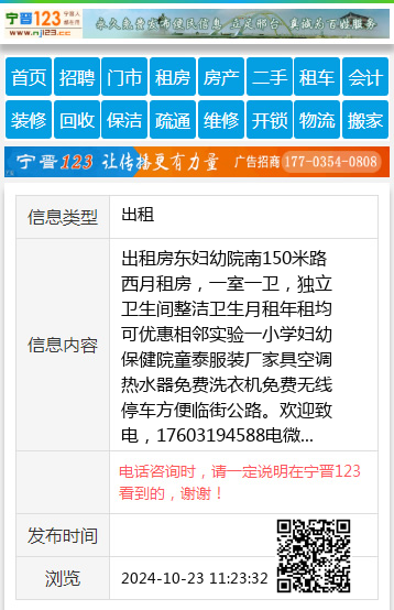 出租房东妇幼院南150米路西月租房,一室一卫,独立卫生间整洁卫生月租年租均可优惠相邻实验一小学妇幼保健院童泰服装厂家具空调热水器免费洗衣机免费无线停车方便临街公路。欢迎致电,17603194588电微 【电话咨询时,请一定说明在宁晋123看到的,谢谢!】 |