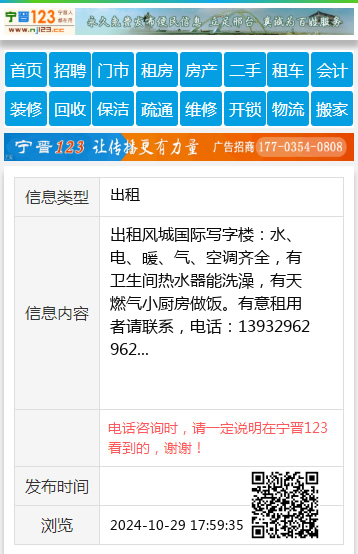 出租风城国际写字楼:水、电、暖、气、空调齐全,有卫生间热水器能洗澡,有天燃气小厨房做饭。有意租用者请联系,电话:13932962962 【电话咨询时,请一定说明在宁晋123看到的,谢谢!】 |