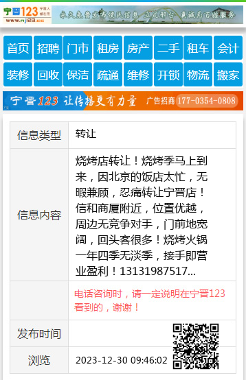 烧烤店转让!烧烤季马上到来,因北京的饭店太忙,无暇兼顾,忍痛转让宁晋店!信和商厦附近,位置优越,周边无竞争对手,门前地宽阔,回头客很多!烧烤火锅一年四季无淡季,接手即营业盈利!13131987517 【电话咨询时,请一定说明在宁晋123看到的,谢谢!】 |