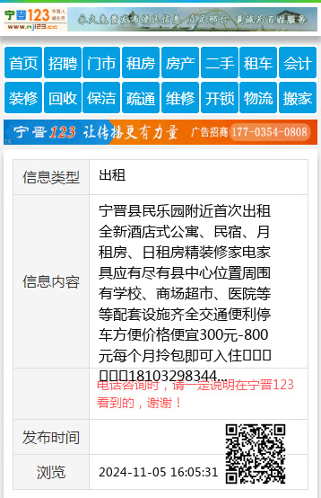 宁晋县民乐园附近首次出租全新酒店式公寓、民宿、月租房、日租房精装修家电家具应有尽有县中心位置周围有学校、商场超市、医院等等配套设施齐全交通便利停车方便价格便宜300元-800元每个月拎包即可入住☎️18103298344 【电话咨询时,请一定说明在宁晋123看到的,谢谢!】 |