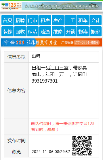 出租一品江山三室,带家具家电,年租一万二,详询13931937301