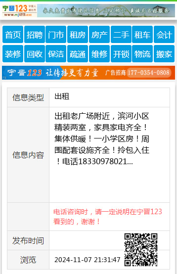 出租老广场附近,滨河小区精装两室,家具家电齐全!集体供暖!一小学区房!周围配套设施齐全!拎包入住!电话18330978021 【电话咨询时,请一定说明在宁晋123看到的,谢谢!】 |