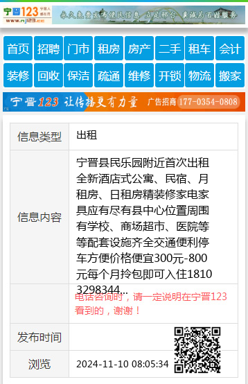 宁晋县民乐园附近首次出租全新酒店式公寓、民宿、月租房、日租房精装修家电家具应有尽有县中心位置周围有学校、商场超市、医院等等配套设施齐全交通便利停车方便价格便宜300元-800元每个月拎包即可入住18103298344 【电话咨询时,请一定说明在宁晋123看到的,谢谢!】 |