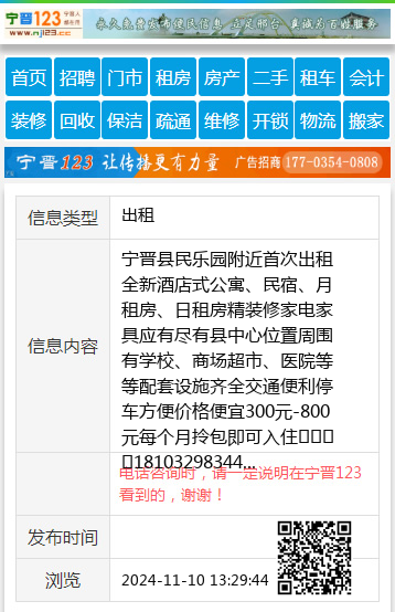 宁晋县民乐园附近首次出租全新酒店式公寓、民宿、月租房、日租房精装修家电家具应有尽有县中心位置周围有学校、商场超市、医院等等配套设施齐全交通便利停车方便价格便宜300元-800元每个月拎包即可入住18103298344 【电话咨询时,请一定说明在宁晋123看到的,谢谢!】 |
