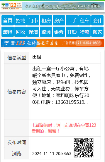 出租一室一厅小公寓,有地暖全新家具家电,免费wifi,独立厨房,卫生间,拎包即可入住,无物业费,停车方便!地址:颐和明珠东行300米 电话:13663195519 【电话咨询时,请一定说明在宁晋123看到的,谢谢!】 |