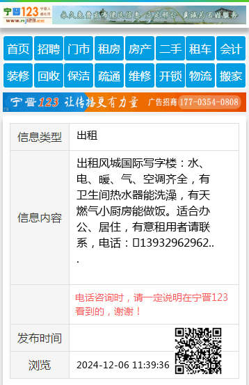 出租风城国际写字楼:水、电、暖、气、空调齐全,有卫生间热水器能洗澡,有天燃气小厨房能做饭。适合办公、居住,有意租用者请联系,电话:13932962962 【电话咨询时,请一定说明在宁晋123看到的,谢谢!】 |