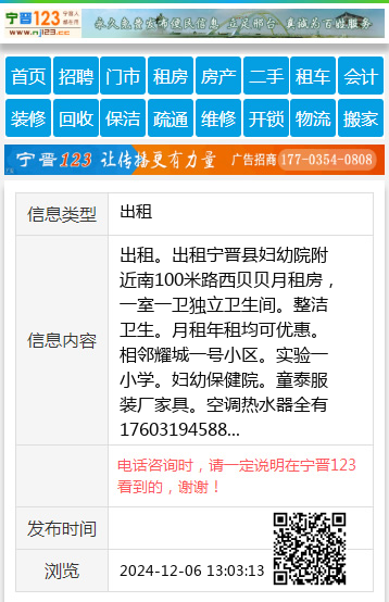 出租。出租宁晋县妇幼院附近南100米路西贝贝月租房,一室一卫独立卫生间。整洁卫生。月租年租均可优惠。相邻耀城一号小区。实验一小学。妇幼保健院。童泰服装厂家具。空调热水器全有17603194588 【电话咨询时,请一定说明在宁晋123看到的,谢谢!】 |