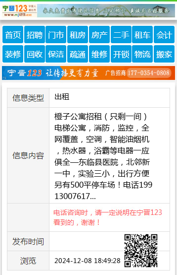 橙子公寓招租(只剩一间)电梯公寓,消防,监控,全网覆盖,空调,智能油烟机,热水器,浴霸等电器一应俱全—东临县医院,北邻新一中,实验三小,出行方便另有500平停车场!电话19913007617 【电话咨询时,请一定说明在宁晋123看到的,谢谢!】 |