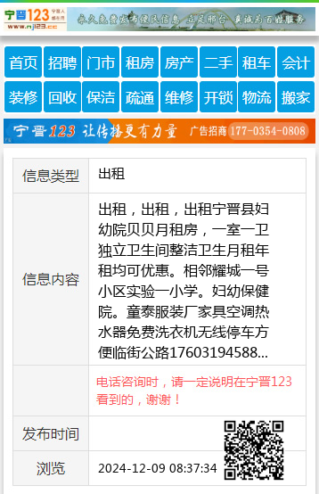 出租,出租,出租宁晋县妇幼院贝贝月租房,一室一卫独立卫生间整洁卫生月租年租均可优惠。相邻耀城一号小区实验一小学。妇幼保健院。童泰服装厂家具空调热水器免费洗衣机无线停车方便临街公路17603194588 【电话咨询时,请一定说明在宁晋123看到的,谢谢!】 |