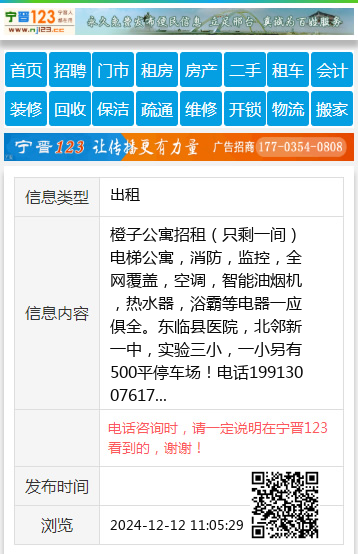 橙子公寓招租(只剩一间)电梯公寓,消防,监控,全网覆盖,空调,智能油烟机,热水器,浴霸等电器一应俱全。东临县医院,北邻新一中,实验三小,一小另有500平停车场!电话19913007617 【电话咨询时,请一定说明在宁晋123看到的,谢谢!】 |