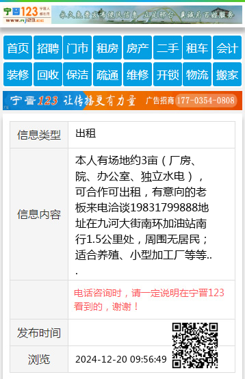 本人有场地约3亩(厂房、院、办公室、独立水电),可合作可出租,有意向的老板来电洽谈19831799888地址在九河大街南环加油站南行1.5公里处,周围无居民;适合养殖、小型加工厂等等 【电话咨询时,请一定说明在宁晋123看到的,谢谢!】 |