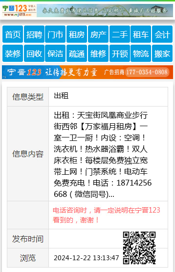 出租:天宝街凤凰商业步行街西邻【万家福月租房】一室一卫一厨!内设:空调!洗衣机!热水器浴霸!双人床衣柜!每楼层免费独立宽带上网!门禁系统!电动车免费充电!电话:18714256668(微信同号) 【电话咨询时,请一定说明在宁晋123看到的,谢谢!】 |