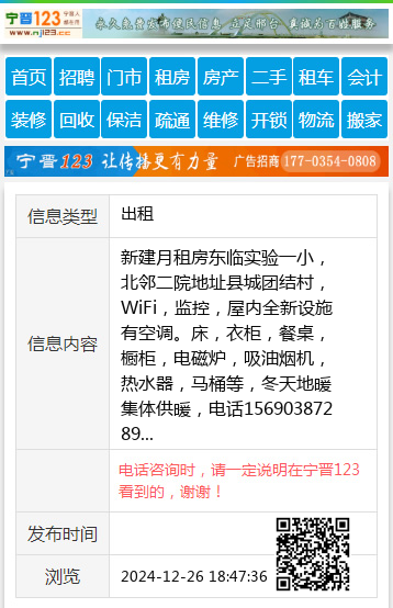 新建月租房东临实验一小,北邻二院地址县城团结村,WiFi,监控,屋内全新设施有空调。床,衣柜,餐桌,橱柜,电磁炉,吸油烟机,热水器,马桶等,冬天地暖集体供暖,电话15690387289 【电话咨询时,请一定说明在宁晋123看到的,谢谢!】 |