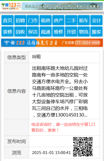 出租南环路大地幼儿园对过路南有一亩多地的空院一处交通方便水电齐全。另去小马路距南环路约一公里处有十几亩地的空院出租,可放大型设备停车场汽修厂彩钢瓦三间自己的水井,三相电,交通方便13001450130 【电话咨询时,请一定说明在宁晋123看到的,谢谢!】 |