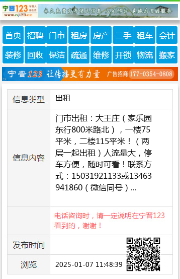门市出租:大王庄(家乐园东行800米路北),一楼75平米,二楼115平米!(两层一起出租)人流量大,停车方便,随时可看!