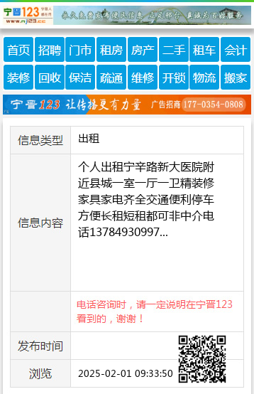 个人出租宁辛路新大医院附近县城一室一厅一卫精装修家具家电齐全交通便利停车方便长租短租都可非中介电话13784930997 【电话咨询时,请一定说明在宁晋123看到的,谢谢!】 |